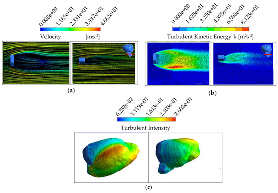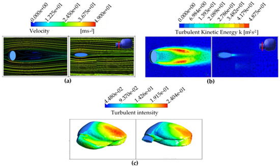 In Figure 6a–c, velocity streamlines, turbulent kinetic energies, and turbulent intensity distribution on zero total pressure iso-surfaces are demonstrated for T1 (maximum length) and T7 (minimum length) geometries of Model 2. The wake region of T1 geometry was longer than that of T7 geometry, and vortices were formed in this region in both geometries. The highest turbulent kinetic energy values behind the mirror arm were obtained as 89.38 m2/s2 and 51.23 m2/s2 in T1 and T7 geometries, respectively. The high turbulent kinetic energy region in the flow over T1 geometry was larger than that of T7. The mirror arm vicinity of the T1 geometry was exposed to the highest mean CD value, the zero total pressure regions expanded, and high turbulence densities were detected.