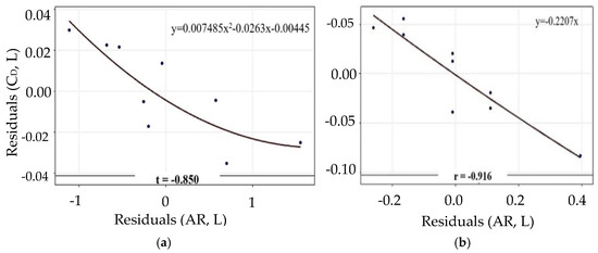 The variations in drag coefficient with respect to aspect ratio in the flow over Model 1 and Model 2 are given in Figure 7a and Figure 7b, respectively. Partial correlation was applied by subtracting the effect of length to determine only the effect of aspect ratio. For Model 1, Spearman correlation was employed because the data points in the scatter plot were non-linear. The correlation coefficient value of −0.850 indicated that there was a strong and negative correlation between the aspect ratio and the drag coefficient. It has been observed that the drag coefficient decreased as the aspect ratio increased, in agreement with the study of Meyer and Erland [23]. In addition, a quadratic regression curve fitting to represent the scatter plot was also performed. For Model 2 the Pearson correlation was used because of the linear data points in the scatter plot. The value of the correlation coefficient was obtained as −0.916. The drag coefficient decreased as the aspect ratio increased, similar to Model 1. A linear regression curve fitting to represent the scatter plot was also carried out.