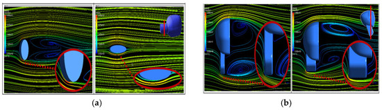 The velocity streamlines the flow over T6 and T9 geometries of Model 1 are detailed in Figure 8a. The aspect ratios of the mirror with T6 and T9 geometries had a minimum and a maximum value of 0.66 and 3.33, respectively. The results showed that the high aspect ratio caused a streamlined geometry around the mirror arm and delayed the flow separations. The velocity streamlines for T4 and T9 geometries of Model 2 with same arm length are presented in Figure 8b. The T4 geometry had a minimum aspect ratio (0.23), while the T9 geometry had a maximum aspect ratio (0.79). Flow separation around the mirror arm with the higher aspect ratio of the T9 geometry occurred further compared to the T4 geometry.