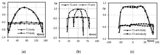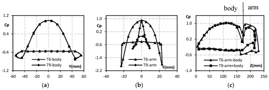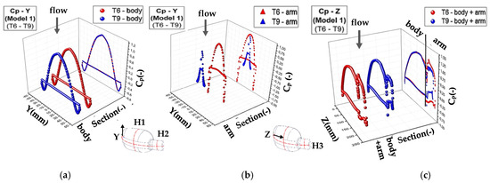 Figure 10a–c present the experimental CP distributions of the T6 and T9 geometries of Model 1 for the H1, H2, and H3 lines, respectively. The maximum values of CP on the H1 line were obtained at y = 0 as nearly 0.97, while those of minimum value were around −0.66 for both geometries. A symmetric distribution was observed on the H1 line around y = 0 for the static pressure, as stated Wang et al. [24]. The CP values of the mirror arm on the H2 line were obtained in the range of −1.91–0.90 for T6, and −0.83–0.79 for T9, respectively. The CP values of the body and arm on the H3 line were found between −0.52 and 1.02 for T6, and −0.36 and 0.99 for T9. For all geometries, the pressure coefficients took minimum values where the boundary layer separated. The mean drag coefficients of the T6 and T9 geometries based on pressure values were calculated as 0.434 and 0.381, respectively.