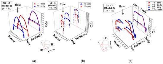 The numerical pressure coefficient distributions of T1 and T7 geometries of Model 2: (a) H1 line, (b) H2 line, and (c) H3 line.