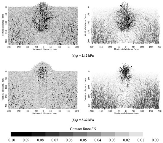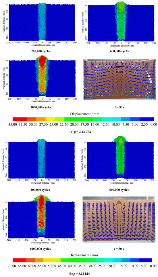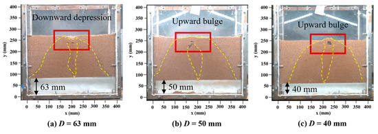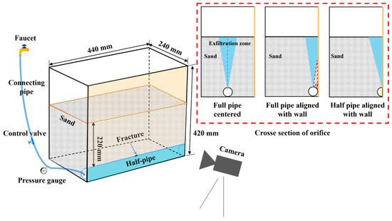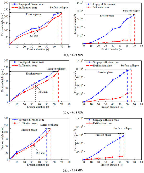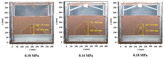 - Under high inlet pressure (pc = 0.18 MPa), pressurized water flow from the fracture strongly inhibited lateral seepage diffusion of water, resulting in a height difference of 16.4 mm between the exfiltration zone and seepage diffusion zone. Under low inlet pressure (pc = 0.10 MPa), there was an extended seepage diffusion zone, and the height difference between the exfiltration zone and seepage diffusion zone increased to 38.6 mm. This phenomenon was related to the balance between hydraulic gradient and critical shear stress of soil.