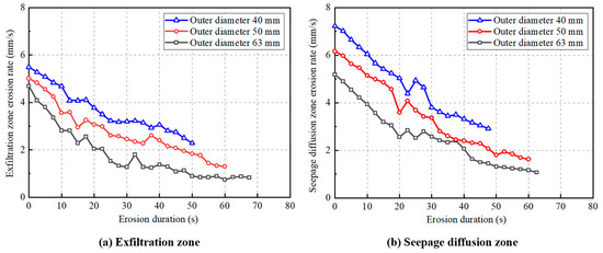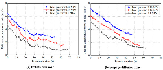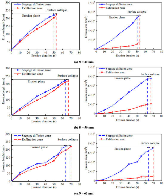 - The inlet pressure had an effect on the ground collapse process; when the inlet pressure of the laboratory test model increased from 0.10 MPa to 0.18 MPa, the ground collapse duration time of the fractured prototype pipe was reduced by 22–28% (from 125 s to 98 s, and the initial exfiltration velocity increased from 5.2 mm/s to 9.4 mm/s. According to the laboratory test results, the erosion velocity was exponentially related to time. Reducing the pipe diameter was equivalent to increasing the water pressure. Under a small pipe diameter, there was a cavity between the exfiltration zone and the ground surface, which caused ground bulging. Under a large pipe diameter, the cavity diminished and ground subsidence occurred. The formation of the cavity was related to the erosion height and flow pressure of the erosion process.