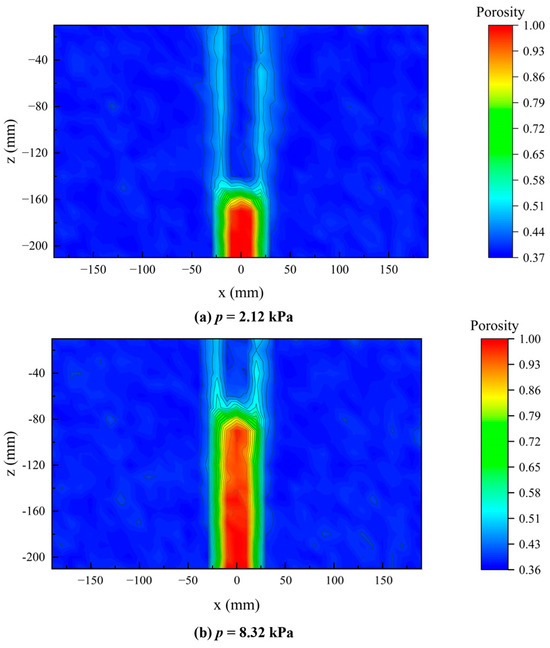 - Both the laboratory model tests and numerical simulation show that the erosion zone can be divided into two zones, the exfiltration zone and the seepage diffusion zone. Within the exfiltration zone, an entrainment phenomenon occurred in the lateral section, while a vortex-induced soil–water mixture formed in the middle section due to resistance from the soil weight. Soil erosion was rapid in the exfiltration zone, resulting in a significant increase in local porosity. In some cases, local porosity in exfiltration zone could reach 1.0, meaning there were no soil particles remaining in those regions.