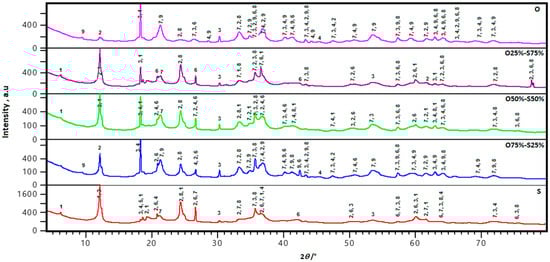 XRD patterns of samples fed to the Bond mill. 1—clinochlore: [(MgFeAl)6(SiCr)4O10(OH)8]; 2—lizardite: Mg3Si2O5(OH)4; 3—maghemite: Fe21.16O31.92; 4 and 5—gibbsite: Al(OH)3; 6—quartz: SiO2; 7—goethite: FeOOH; 8—hematite: Fe2O3; 9—talc: [Mg3(Si2O5)2(OH)2].