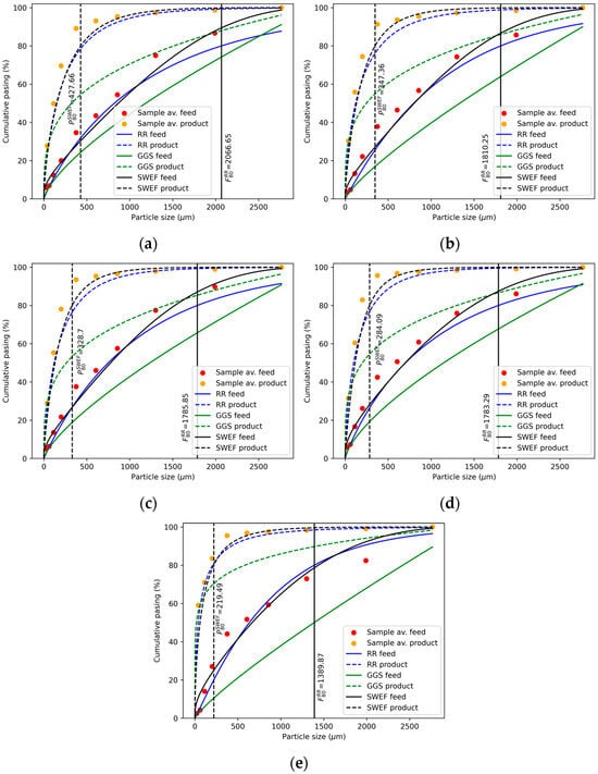 Evaluation of granulometric models for the mineral fed and product to the ball mill for the following configurations: overburden [100%] (a); overburden [75%] and saprolite [25%] (b); overburden [50%] and saprolite [50%] (c); overburden [25%] and saprolite [75%] (d); saprolite [100%] (e).