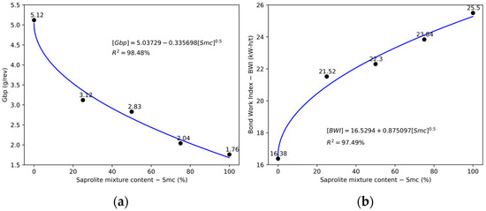 The Bond Work Index analysis reveals that saprolite is the most challenging ore to grind, with specific energy consumption increasing from 16.38 kWh/t to 25.50 kWh/t as saprolite content in the mixtures rises. This reflects a monotonic increasing trend, well represented by a fitted model with a coefficient of determination of 98.54%. Conversely, the Gbp exhibits a monotonic decrease, confirming that the grinding process becomes more difficult as the proportion of saprolite increases. This behavior is likely attributed to the inherent hardness of the material and physical phenomena associated with fragmentation. A declining Gbp also implies that a higher energy input is required to achieve further particle size reduction.