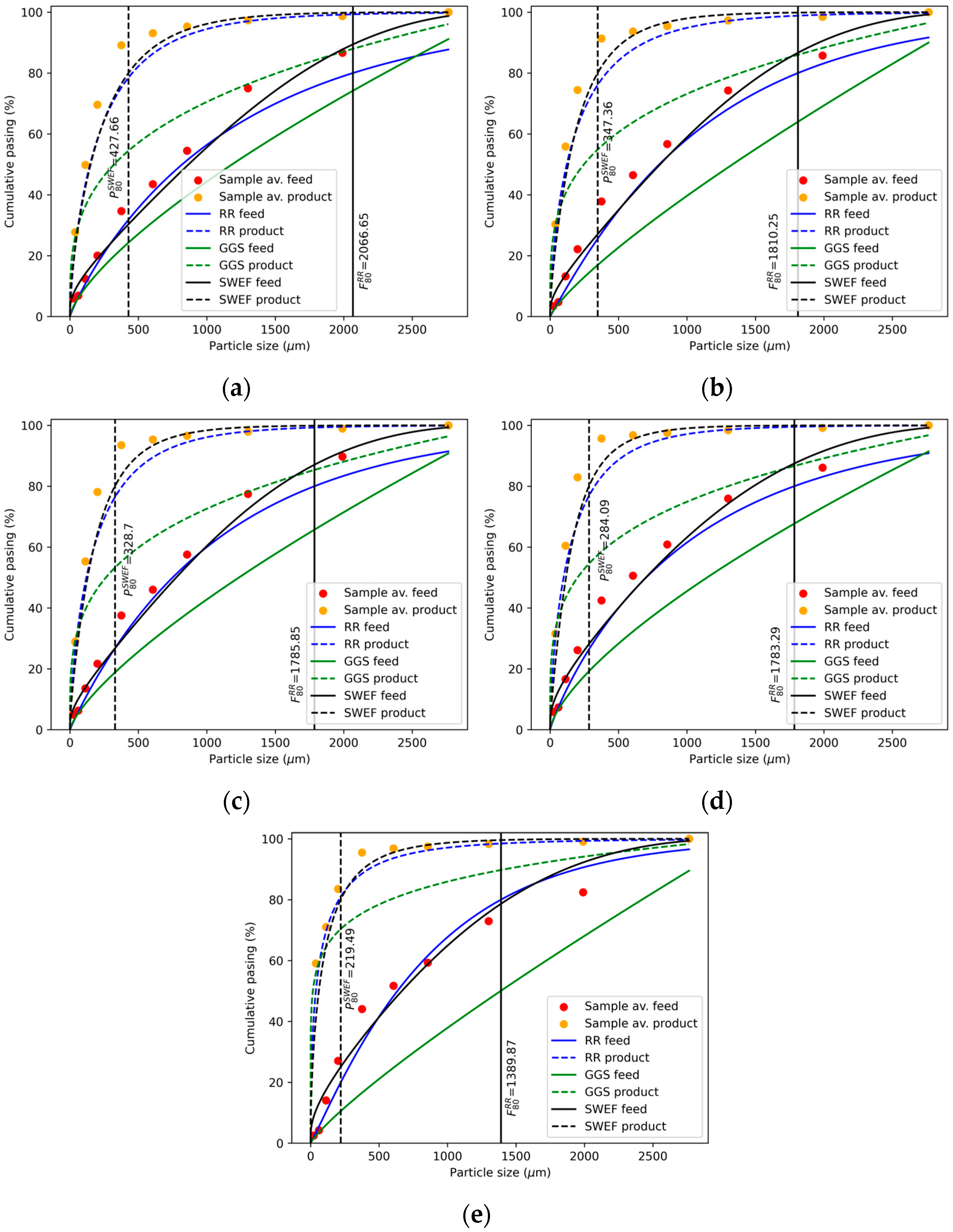 Samples | F80 (μm) RR Function | P80 (μm) SWEF Function | F80/P80 |