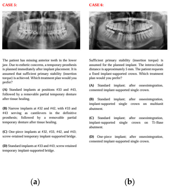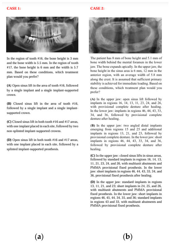Fourteen anonymized real patient cases with pre-implant surgery panoramic images were selected for the study. 14 cases were selected retrospectively from the patient records of the Department of Prosthodontics at Ankara University. The selection was performed jointly by one prosthodontist and one oral surgeon, based on representations of common clinical scenarios in implantology from simpler cases to more complex cases (single tooth loss, partial edentulism, and full-arch cases). Cases with poor radiographic quality, systemic contraindications, or unclear treatment history were excluded. To facilitate responses from both clinicians and the AI model, tomographic data, interocclusal distance, and other relevant surgical and prosthetic information were provided in written form, while only panoramic radiographs were presented visually. Due to the very large file sizes of cone-beam computed tomography (CBCT) datasets, which exceeded the upload limits, CBCT images were not provided; however, all clinically relevant three-dimensional information obtainable from CBCT was summarized within the case descriptions to ensure sufficient data for treatment planning. It was assumed that all patients mentioned in the case scenarios had good systemic health, adequate oral hygiene, and no financial restrictions for standardization. Clinical scenarios were prepared with four alternative treatment options for each case. The four management options for each case were drafted by one senior prosthodontist and one oral surgeon with >10 years of experience. The options were reviewed for clinical plausibility and to ensure that at least two alternatives represented commonly accepted approaches, while others reflected less preferred yet still clinically possible options (not intentionally wrong or contraindicated). The aim was not to distinguish “correct vs. incorrect” answers but to evaluate preference tendencies between clinicians and AI when faced with multiple feasible solutions. Scenarios included surgical parameters such as the number, size, location, and position of implants, the need for additional surgical procedures, and the placement protocol, as well as prosthetic factors including prosthesis type and number, location, abutment selection, material preferences, and loading protocols. Prosthetic and surgical considerations varied for each question. The panoramic radiographs, along with the case descriptions and four treatment options, are presented in Figure 1, Figure 2, Figure 3, Figure 4, Figure 5, Figure 6 and Figure 7.