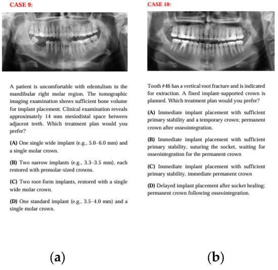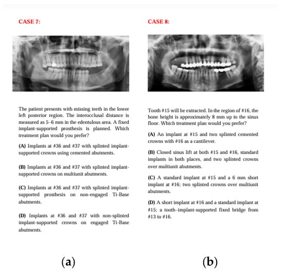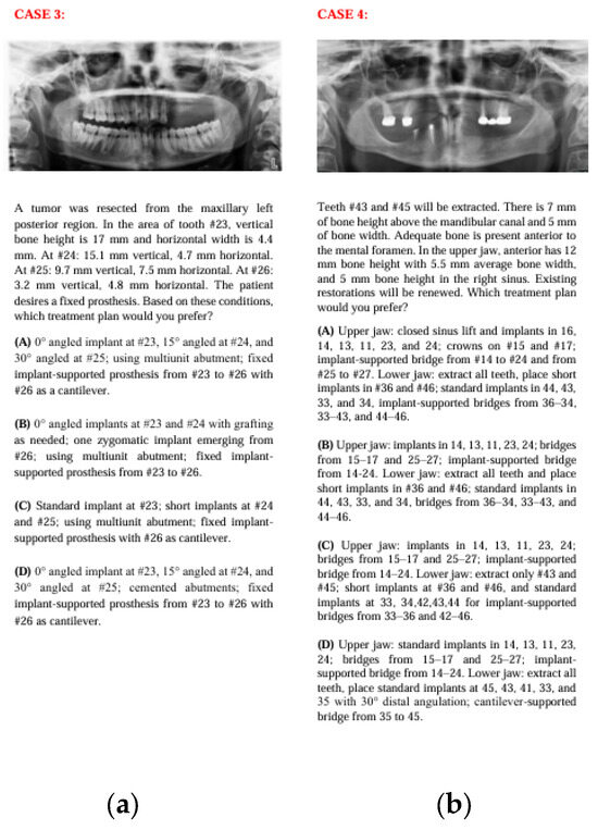 The survey scenarios were designed to reflect the commonly seen clinical cases that allow multiple treatment plans. Panoramic radiographs were provided to facilitate the decision-making process, while tomographic data and relevant clinical details were summarized in written form to minimize data load and standardize the evaluation process.