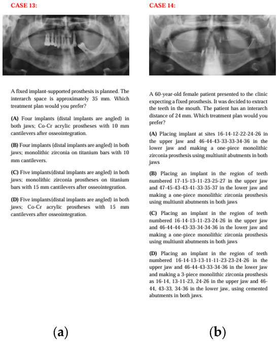 The panoramic radiographs, descriptions, and four treatment options of Case 13 (a) and Case 14 (b).