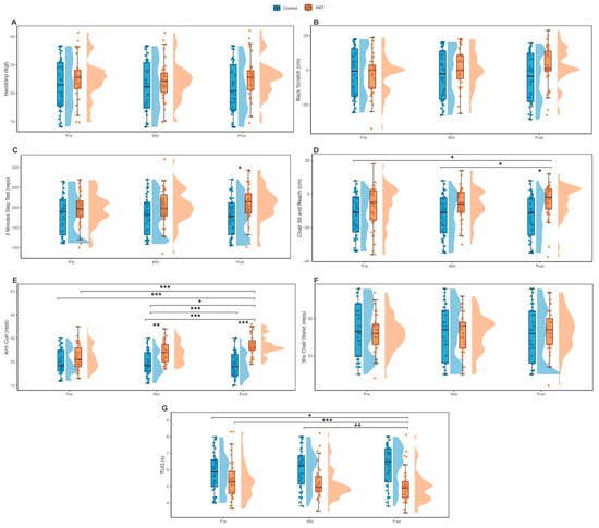 Figure 2 presents the distribution and evolution of all functional fitness outcomes using violin plots overlaid with boxplots and individual data points for both groups (HIIT and Control) at baseline (Pre), mid-point (Mid), and post-intervention (Post). The violin shapes illustrate the distribution density of the data, while the boxplots indicate the median and interquartile range (IQR). Individual dots represent raw participant scores, allowing for visual inspection of intra-group variability. Statistical differences identified in the nonparametric post hoc analyses are marked with asterisks (* p < 0.05; ** p < 0.01; *** p < 0.001), highlighting significant changes over time within or between groups.