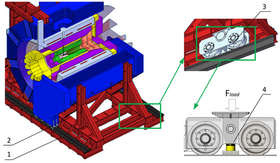 The detector is a device weighing approximately 360 tons, which must be able to move several dozen millimetres vertically from the transport position to the working position. This implies the use of small-sized hydraulic actuators operating at high working pressure, up to 70 MPa. The main difficulty of positioning results from the need to use several actuators with synchronized movement with specified maximum accelerations and speeds and with the required accuracy of extension synchronization. The analyzed system is shown in Figure 1. It consists of a frame with the necessary equipment (2) placed on a rail system (1). The total weight equals approximately tonnes. Six high-capacity carriages (3) are used to move the frame horizontally between the home and operating positions. Each carriage contains two Demag RAE/RNE crane wheels with the 600kN capacity per wheel. The whole construction must also be able to move vertically to obtain the operational position precisely, with the accuracy of mm. Furthermore, the maximum acceleration while lifting must be below m/s2 and the maximum speed must not exceed m/s. The maximum lift height is mm. A system of hydraulic cylinders (4) mounted within the carriages is proposed to fulfill this requirement.