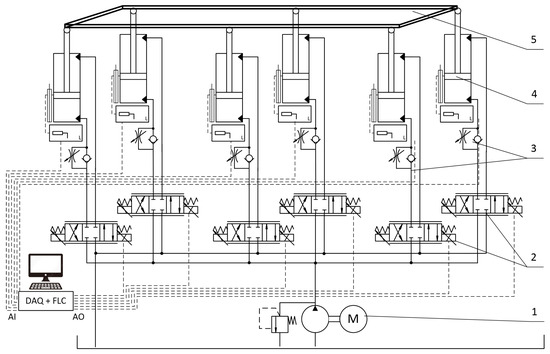 Hydraulic system designed for vertical positioning: 1—hydraulic power supply, 2—proportional control valves, 3—check-throttle valves, 4—hydraulic cylinders, 5—frame, FLC—fuzzy logic controller.
