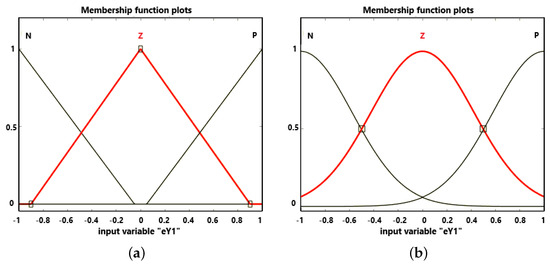 Example linear-type and Gaussian-type membership functions of the fuzzified parameter in the Fuzzy Logic Toolbox designer window are shown in Figure 3a and Figure 3b, respectively.
