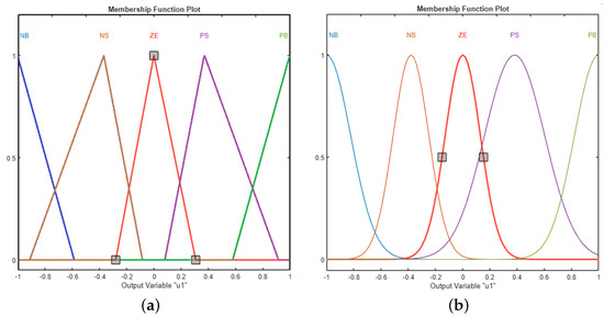 The system outputs are normalized values of control signal changes computed independently for all six proportional control valves. The computational domain of each output signal was divided into five fuzzy sets: NB (Negative Big), NS (Negative Small), Z (Zero), PS (Positive Small) and PB (Positive Big). For consistency, “Z” in the input sets is labeled “ZE” in the output rules (Table 1 and Figure 4), meaning “Zero.” All abbreviations are now explained in the text. Membership functions analogous to those used for the input signals were tested. Linear and Gaussian membership functions of the signal are shown in Figure 4a,b.