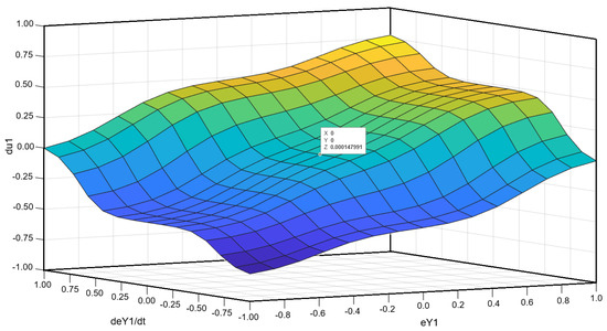 The last stage involves determining the output signals’ sharp (numerical) values in the defuzzification process, using the activated output fuzzy sets and the selected method. The centre of gravity (CoG, centroid) method was used following general recommendations. An example of a control surface obtained for membership functions of Gauss type and fuzzy operators is shown in Figure 5. The surface considers the normalization of input and output signals to the interval . The graph shows the zero point value, ensuring the stability of the system operation.