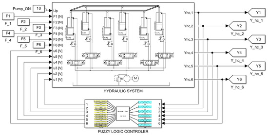 The principal part of the simulation model was built in Simulink, while the FLC was implemented using the fuzzy logic designer tool. Connections between two main block diagrams modelling the hydraulic system and the FLC are shown in Figure 6. The external load forces constituting hydraulic subsystem inputs are marked to . The following inputs are the FLC-generated proportional control valve control signals to and the pump power supply . In turn, the to output signals are current vertical positions of hydraulic cylinders, constituting inputs for the FLC.