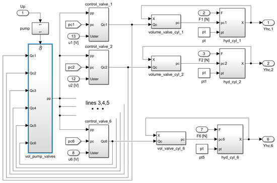 Components of the hydraulic subsystem are shown in Figure 7, including a pump and a lumped volume of the supply line . Next, there are six parallel lines, containing control valve blocks, hydraulic cylinders and lumped volumes between them. The individual blocks are connected via pressure signals , to , , flow rate signals , to and hydraulic cylinder positions to .
