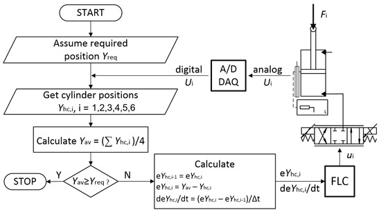 Each simulation was performed according to the scheme shown in Figure 8. Initially, the required position was assumed. Then, in the control step i, the current positions were calculated based on the signals from the measuring transducers. The determined average value of the displacement was compared with . Current error values and their derivatives were calculated for each actuator if the required position had not been reached. On their basis, FLC determined the control signals for the proportional valves . The following control step was started after the subsequent reading of signals from the displacement transducers .