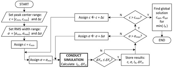 Initially, the allowable ranges of peak centre c and RMS width are established. Next, the domains of all parameters are uniformly searched, starting from their minimum values. The operation consists of establishing the value of c and searching the range of to find values that allow the minimum value of to be obtained. Each obtained solution is verified to ensure that the permissible difference in actuator positions during movement, , is not exceeded. After searching all the required ranges, the optimal solution is found and returned in the global range.