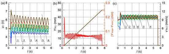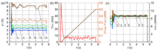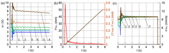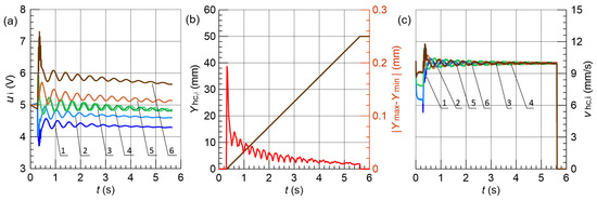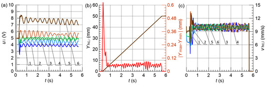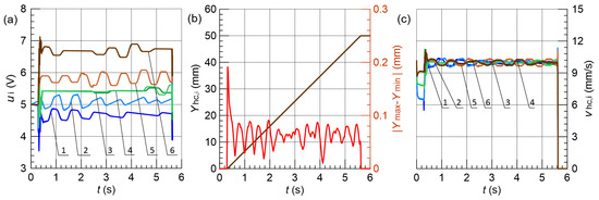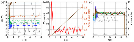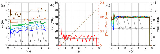 Results obtained for % and FLC3; (a) control signals , (b) vertical displacement , and maximum position error , (c) hydraulic cylinder speed , 1–6—line.