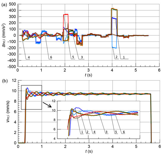 The acceleration profiles in Figure 18a and Figure 19a exhibit characteristic features requiring explanation. The apparent mismatch around s, where velocity slope is steepest but acceleration is not maximal, results from discrete control sampling ( s) combined with valve response delays—velocity, being an integrated quantity, reflects the dominant acceleration trend while instantaneous peaks occur due to transient corrections. Distinct acceleration spikes at s and s correspond to deliberate FLC commands: at s the controller initiates coordinated deceleration as actuators reach 80% of target position, while at s fine positioning corrections eliminate residual synchronization errors. These brief acceleration pulses ( s duration, mm/s) do not produce visible velocity discontinuities due to integration smoothing and partial cancellation among actuators. The control signals in Figure 12a and Figure 16a show corresponding step changes, confirming that acceleration variations result from the discrete-time Mamdani controller’s piecewise-constant output rather than mechanical instabilities.