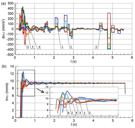 Motion parameters of hydraulic actuators with the FLC3 controller for %; (a) acceleration, (b) speed; 1–6—line.