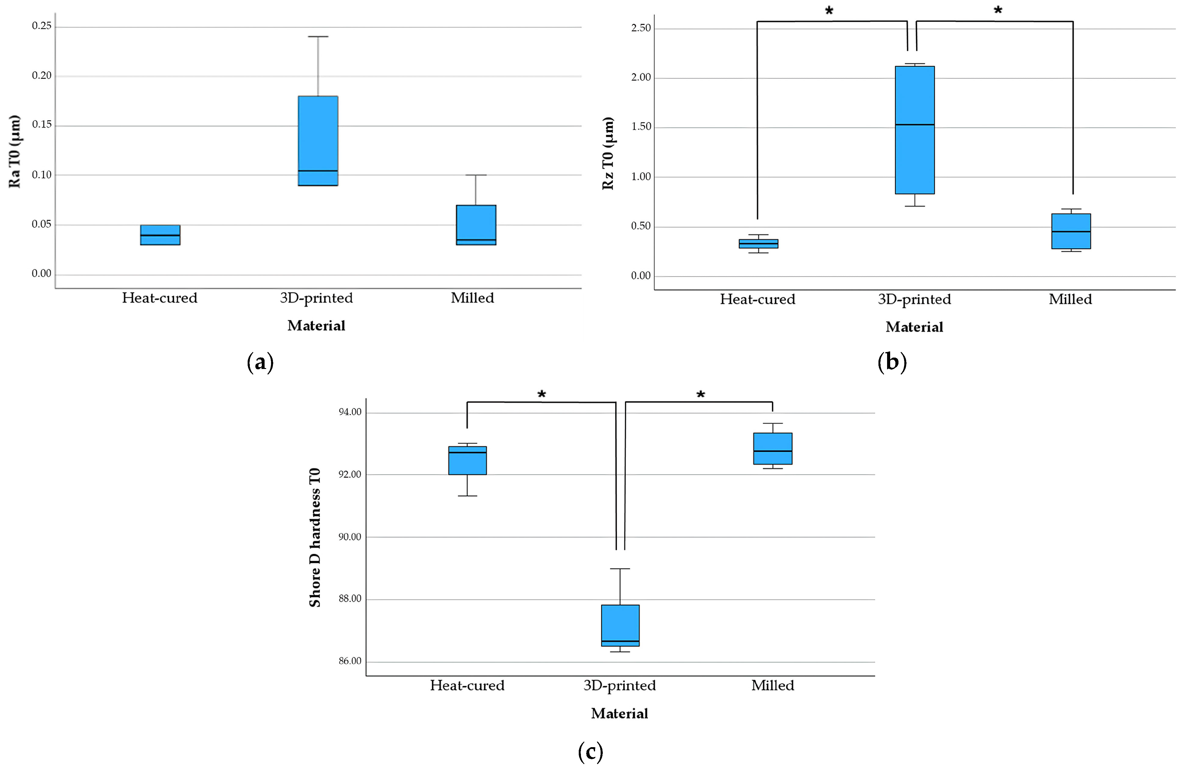 3.1. Baseline Evaluation (T0)—Comparison Between Materials