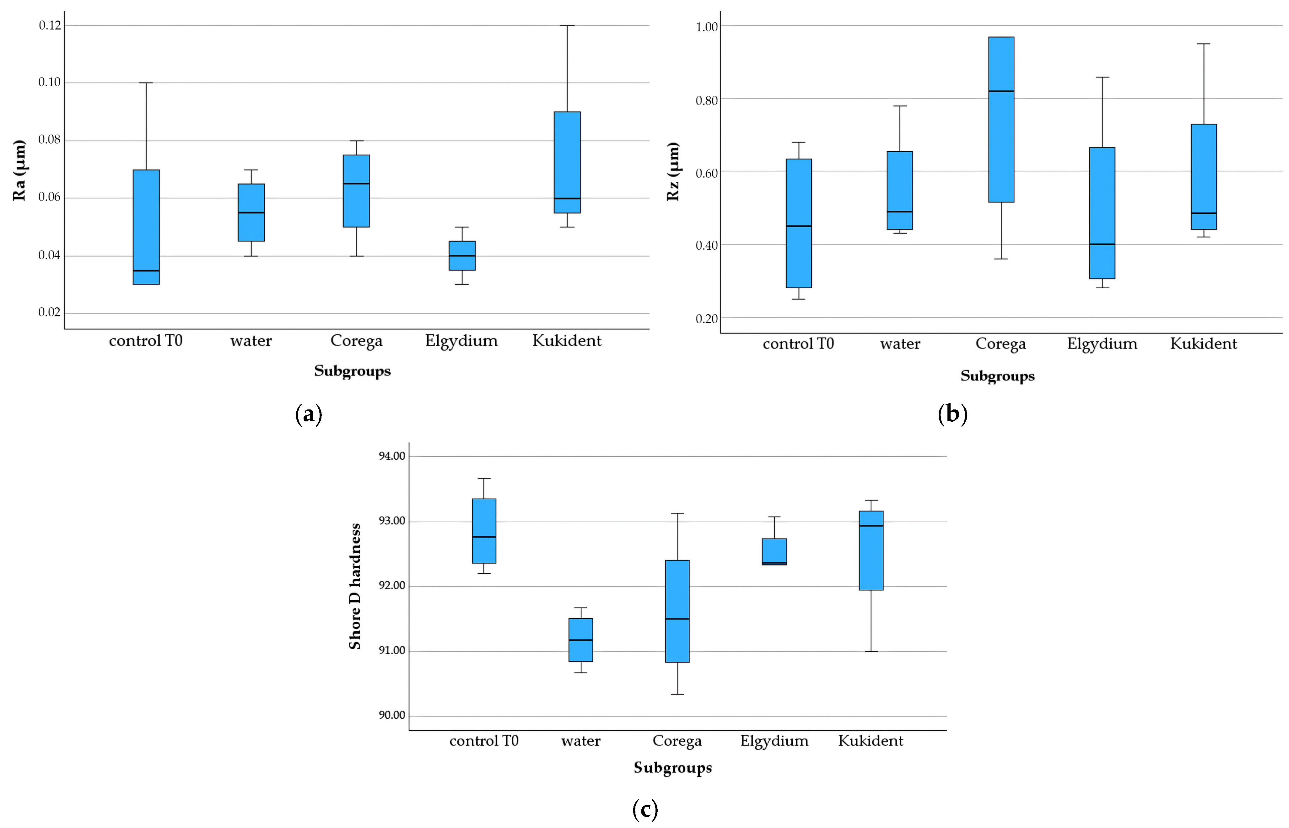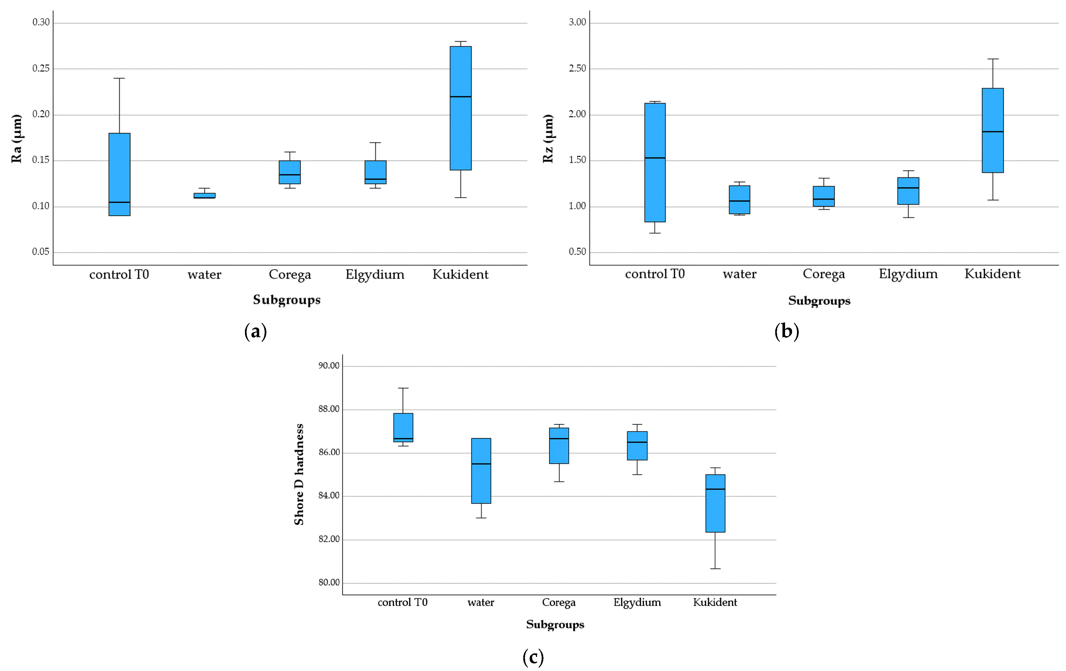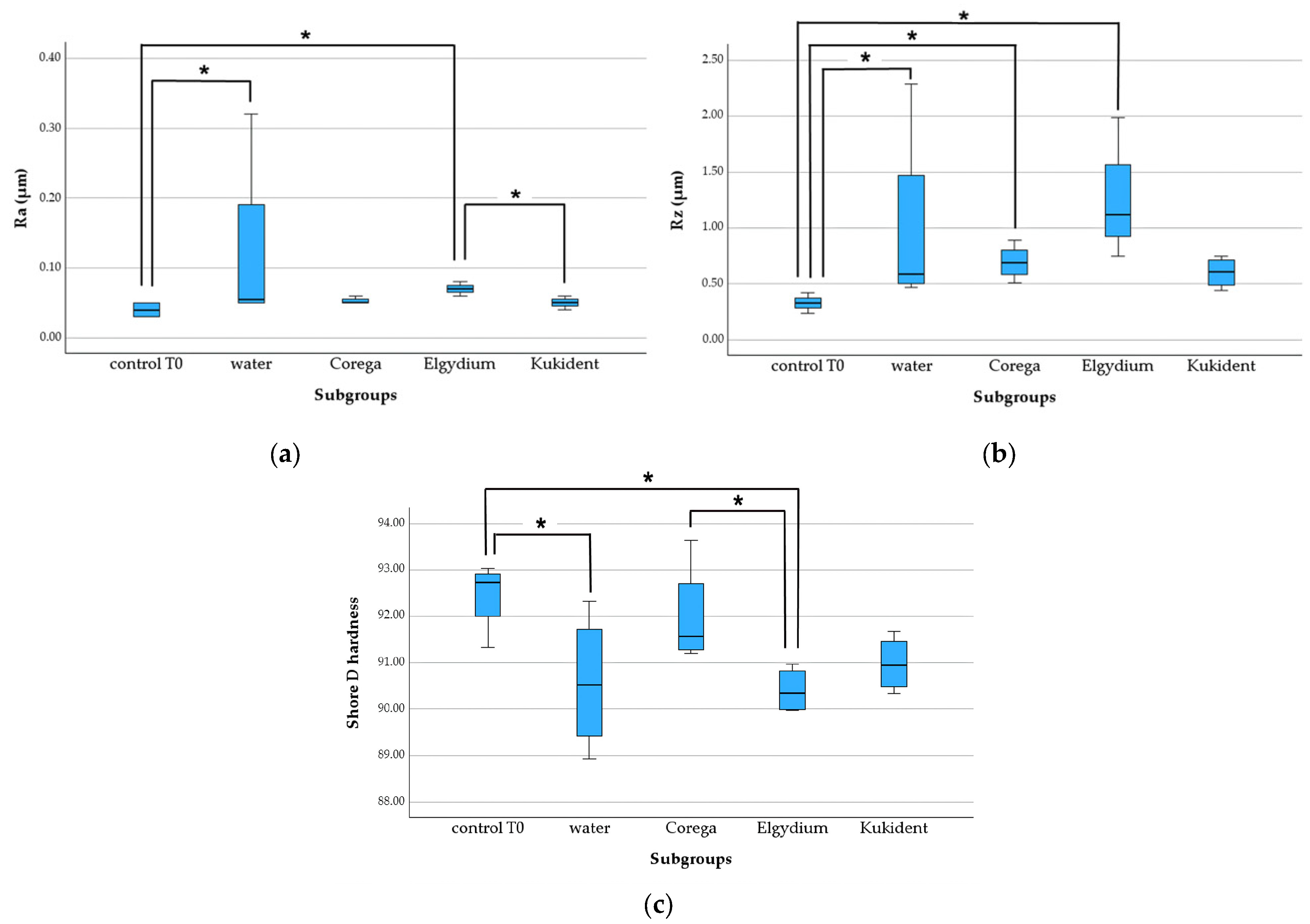- Shore D hardness: control—water (p = 0.023), control—Elgydium (p = 0.009), and Corega—Elgydium (p = 0.031).