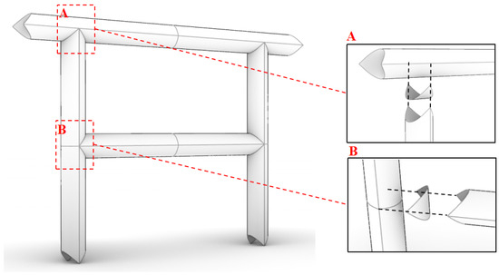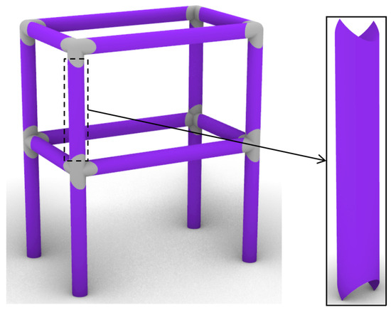 The pillow box configuration is commonly used in packaging due to its excellent deployability and self-locking characteristics [47]. It enables a rapid transition from a flat state to a folded state, while maintaining the folded shape without the need for additional fastening components. Based on these advantages, this study proposes a fundamental frame system assembled using pillow box units as structural modules, as illustrated in Figure 1. The structural units are connected via end caps that conform to the cross-sectional geometry of the pillow box. One of the primary design objectives is to achieve rapid construction, while another is to realize lightweight architecture by utilizing the initial curvature-induced prestress inherent in curved-crease origami. The primary focus of this study is the investigation of the mechanical behavior of the column component shown in the figure.
