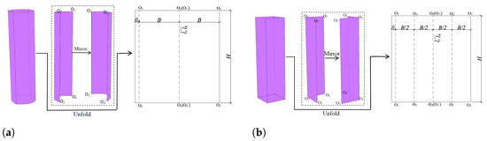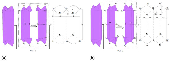 The pillow box column, also referred to as an origami with curved creases column (OCC), is generated from an initial curved surface defined by the arc [48]. This surface is symmetrically extended by mirror reflection across two inclined planes passing through node pairs and , respectively, with each inclined at to the vertical. The result is a symmetric single-crease origami configuration. The pillow box geometry is formed by combining this configuration with its mirror image across the vertical plane, yielding a closed, self-locking form. The detailed crease pattern and geometric dimensions are shown in Figure 2a, where dashed lines indicate fold lines. Here, B denotes the arc length of , H represents the height of the OCC, h denotes the width of the column in its folded state, and indicates the assembly seam allowance. The geometry can be uniquely determined by the above parameters. In addition, to gain deeper insight into the influence of pre-bending on mechanical performance, a corresponding origami column with straight creases (OSC) is designed for comparison. The configuration of the OSC is generated through a process analogous to that of the OCC, as illustrated in Figure 2b.