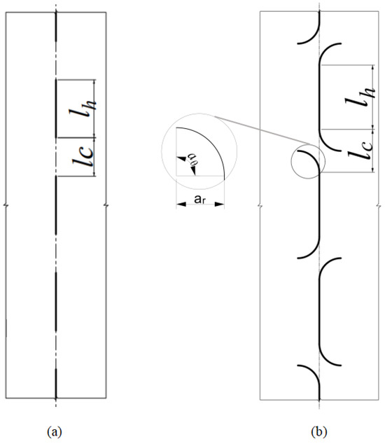 To investigate the influence of crease-weakening schemes on the mechanical performance of pillow box origami columns, this study adopts two commonly used patterns [33,46], as follows: the “dashed-line” type featuring elongated cut slits, and the “slit-hole” type characterized by crescent-shaped openings. Both patterns have been demonstrated to facilitate precise folding in thin-walled materials while maintaining overall structural integrity during loading, as discussed in Section 2.2. Detailed configurations are illustrated in Figure 4. Here, denotes the length of the connected crease segments, is the length of the cut segments, and for the slit-hole type, is the radius of the arc, and represents the central angle.