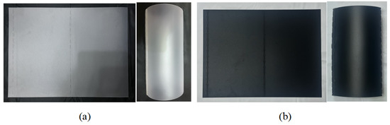 Considering the goal of lightweight applications and foldability, polypropylene (PP) was selected as the prototype material. The PP sheets were laser-cut according to the pattern shown in Figure 3a, and the vertical seams were bonded using high-strength acrylic double-side tape for plastics, metals, and glass, which can resist an adhesive force of approximately 200 N per meter. One specimen was fabricated for each crease-weakening type. PPC1T1D denotes the specimen with dashed-line creases, and PPC1T1H denotes the specimen with slit-hole creases, shown in Figure 5. All specimens share the same global dimensions: width , height , folded cross-sectional width , and thickness . Each unit has a perforated segment length and a connecting segment length . Additionally, for the slit-hole specimen, , and .