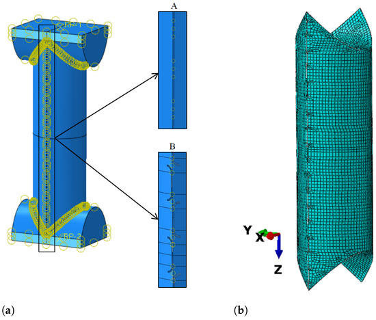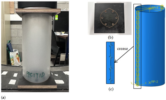 To further investigate the mechanical performance of the pillow box origami columns, shown in Figure 11a, finite element analyses were first conducted on all column types introduced in Section 2.1.1. The numerical model was developed in the finite element software ABAQUS 2021. For each column type, two crease-weakening schemes—dashed-line and slit-hole—were applied, resulting in a total of eight finite element models. The column is meshed with four-node S4R shell elements (shown in Figure 11b), which feature reduced integration, hourglass control, and finite membrane strains, and have been widely applied in the analysis of origami thin-walled structures [50,51]. The element size of 5 mm was determined through a mesh convergence study [50,52]. The top and bottom panels were simplified to be modeled as a single surface with double thickness, rather than two lapped surfaces. Each panel of the column is modeled as a separate part. At the end, creases, panels are connected using tie constraints, which act as idealized hinges with zero rotational stiffness. At side creases, tie constraints are applied to non-perforated regions in the physical prototype and remain unconnected at other locations. The end caps were modeled using eight-node C3D8R solid elements with a mesh size of 10 mm and defined as rigid bodies. Rigid control points were used to constrain end caps. The bottom end cap was fully fixed, and the top end cap was free to translate along the z-axis only. General contact was defined between the column surface and end caps. Additionally, the scaled shapes of eigenmodes were introduced into the nonlinear analyses as initial geometric imperfections. The scaling factor was set to 1/1000. This two-tier validation ensures that the adopted finite element framework achieves both global accuracy (OCC/OSC validation) and local reliability (TCC validation of crease-weakening schemes).