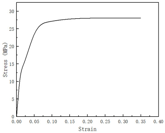The elastic–plastic properties of PP were obtained from tensile tests; the Young’s modulus and yield stress were 1134.06 MPa and 10.64 MPa, respectively. The constitutive relationship curve of the material is shown in Figure 7. Due to equipment limitations, the Poisson’s ratio could not be recorded, so a value of was adopted based on values reported in [49].