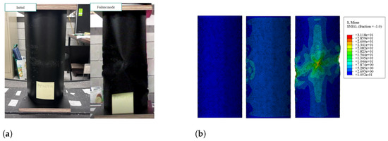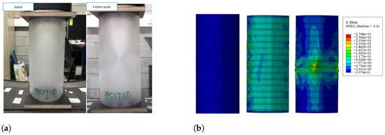 Axial compression deformation process of PPC1T1D. (a) Experimental results; (b) finite element predictions.