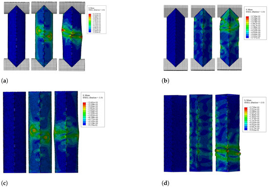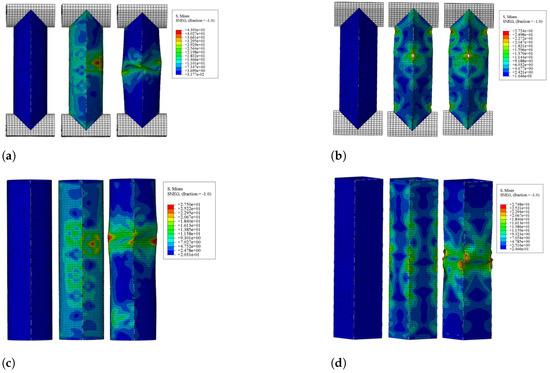 The axial deformation and stress distributions of all specimens are shown in Figure 12 and Figure 13. It can be observed that under axial compression, all columns exhibit a common behavior—after reaching the peak load, the stress becomes highly concentrated along the crease lines. This is attributed to the geometric discontinuity at the creases, which possess relatively lower local stiffness and are prone to early buckling. As the loading continues, all specimens eventually undergo local buckling failure, with pronounced plastic deformation and stress concentration developing along the creases. The results indicate that the curved-crease panels generate circumferential pre-tension due to their initial pre-bending geometry, which causes the arc apex to experience the highest stress at the early loading stage. As the external load increases, stress progressively transfers to the creases, which sustain higher stress levels prior to buckling. Meanwhile, the self-locking effect restricts relative panel motion and effectively raises the critical buckling stress, thereby enhancing the overall load-bearing capacity. In contrast, straight-crease structures lack curvature-induced pre-tension, with stress consistently concentrated along the crease lines, leading to earlier instability and substantially lower ultimate strength and structural stability compared to curved-crease counterparts.
