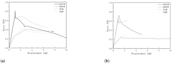 Load–displacement curves (a) “dashed-line” columns and (b) “slit-hole” columns.