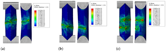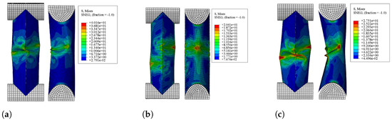 Failure mode and stress distribution: (a) OCC1, (b) OCC2, and (c) OCC3.