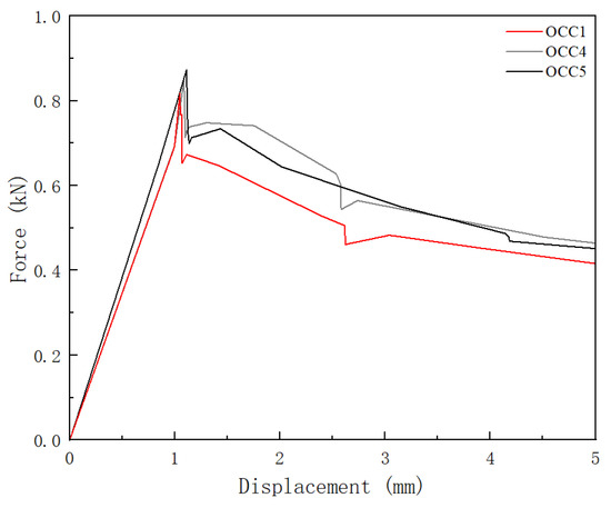 Three OCC-D specimens with different porosities were designed, namely OCC1, OCC4, and OCC5, with porosity values ranging from 0.4 to 0.6. Among them, OCC1 corresponds to the OCC-D specimen previously analyzed in Section 3. The failure modes at a displacement of 5 mm and the corresponding load–displacement curves of all specimens are shown in Figure 15 and Figure 16, respectively.