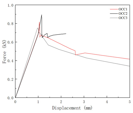 Load–displacement response of OCC1, OCC2, and OCC3.