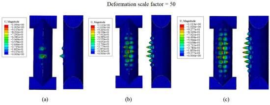 The finite element results indicate that the axial compressive performance of OCC-D columns is influenced by the number of units n. As shown in Figure 16, OCC2 exhibits symmetric deformation, consistent with the axial crushing mode of short columns, whereas OCC1 and OCC3 display asymmetric lateral buckling. The results indicate that, under the same porosity, a greater number of crease units leads to more evenly subdivided weakening, which induces symmetric and multi-point cooperative buckling patterns, thereby effectively dispersing stress concentration and enhancing the overall load-bearing performance. In comparison, OCC2 (36 units) demonstrates the best performance, with a well-organized symmetric buckling mode and the highest peak load; OCC1 (18 units) ranks second, still showing some local concentration; whereas OCC3 (9 units), due to its sparse crease distribution, exhibits highly localized stress concentration, premature buckling, and the lowest peak load. Overall, an appropriate increase in crease density not only reduces the extent of local weakening but also improves column stability and ultimate load capacity. This phenomenon will be discussed in detail in Section 5.1.