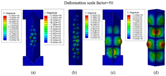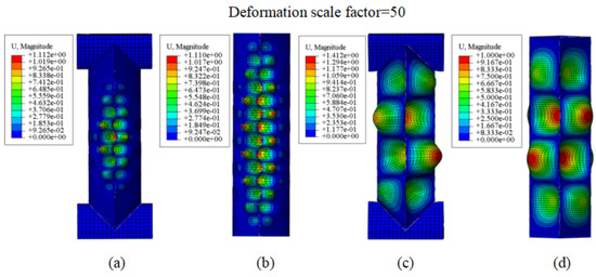 The first buckling mode of (a) OCC-D, (b) TCC-D, (c) OSC-D, and (d) TSC-D.