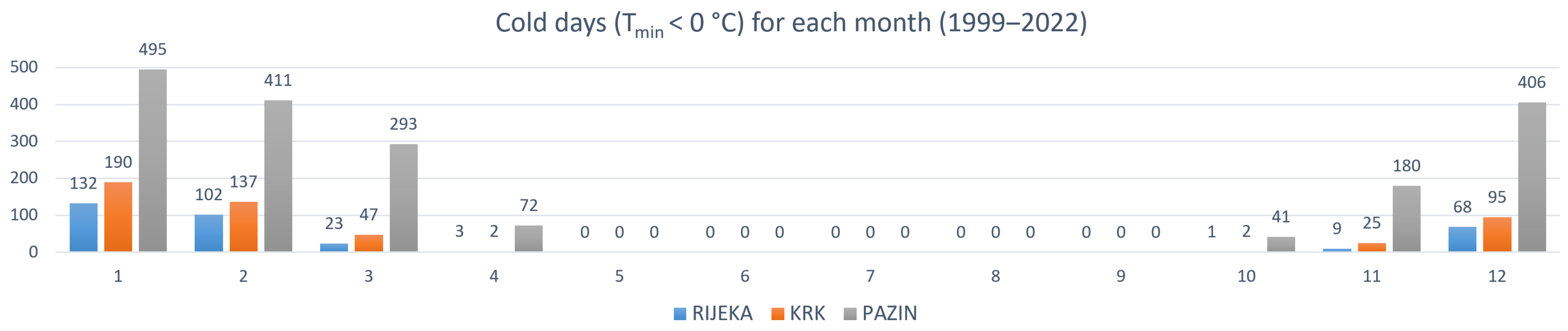 - c—number of days in a given month with cold days (Tmin < 0 °C);