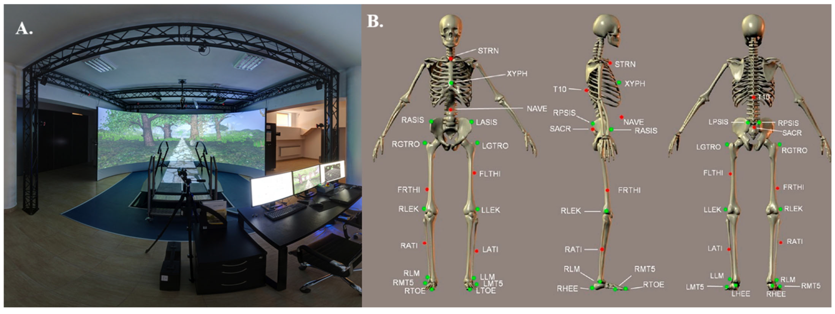 Figure 1A). Movement data were obtained using the Human Body Model 2 (HBM2), which relies on 25 reflective markers attached to participants for motion tracking (