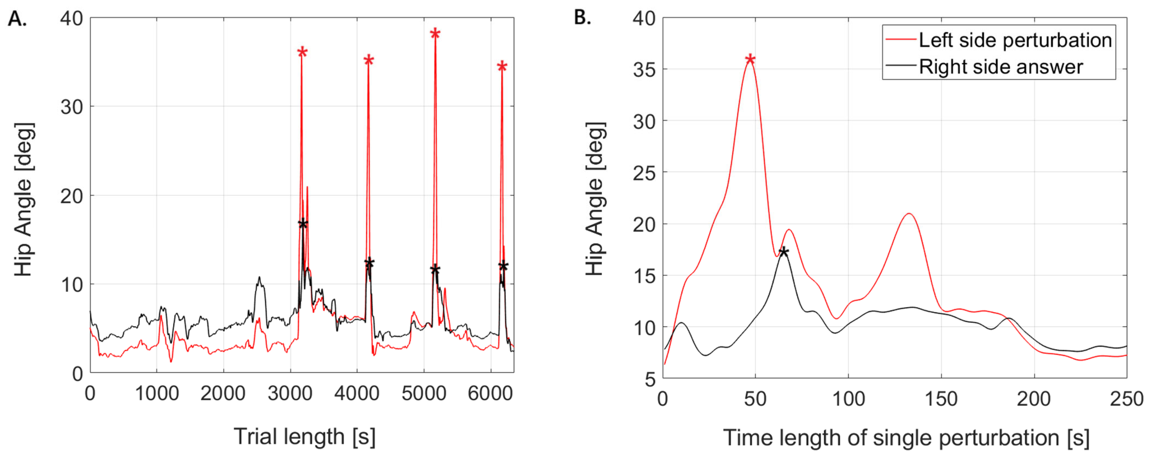 Figure 4). In addition, baseline values were determined as the mean over the interval 0–3000, i.e., prior to the first perturbation, separately for the right and left lower limb. The decision to focus on peak values was motivated by the aim of characterizing the maximal compensatory capacity of the neuromuscular system in response to perturbations. Peaks represent robust, reproducible indicators of the system’s limits in generating stabilizing forces and angles, while minimizing the influence of intra-trial noise and small baseline fluctuations.
