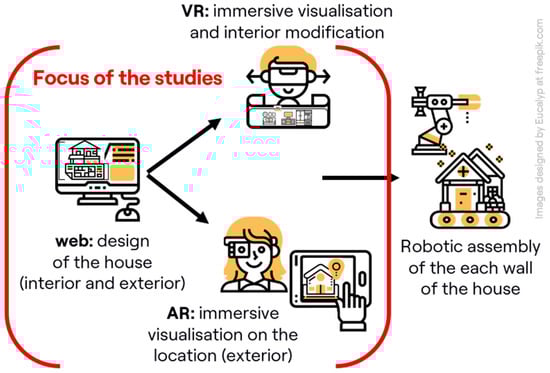 This paper focuses on three primary components of a larger, integrated system (as introduced in Introduction): a web-based design interface, and dedicated VR and AR applications, each shown in Figure 1. The system also comprises an automatic house assembly using robotic production lines, but that is out of scope of this paper. Although each application serves a distinct purpose and employs different technologies, they all interact with the same underlying house model stored on a centralized server.