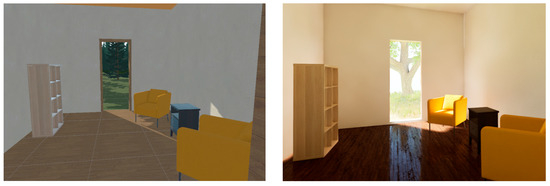 By the third development cycle, the project included two VR applications with equivalent functionality but built using different engines: Unity and Unreal Engine. This dual implementation was introduced to compare differences in performance and user experience (UX) based on engine-level rendering pipelines and interaction models. Both versions were deployed on the same hardware platform—a VR headset (i.e., Meta Quest 3) using handheld controllers for input. It should be noted that in the first two studies the Unity application was run on the untethered Meta Quest 3, while in the third study, due to the requirement of the high-fidelity ray casting shaders implemented in the Unreal VR application, VR applications were run on the PC with a powerful GPU and were displayed on the tethered Meta Quest device. While variations in rendering fidelity and interaction responsiveness are evident (as shown by Figure 5), both VR applications used the same server-hosted data and fulfilled an identical role within the multiplatform design pipeline. Participants in the final user study engaged with both versions, enabling a direct usability and UX comparison.