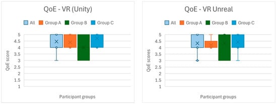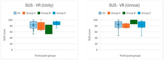 In Study 3, where two VR applications were available, we observed minimal differences in task time between the Unity and Unreal versions. Participants from the returning groups (A and B) spent on average 7 min and 27 s in the Unity VR app vs. 7 min and 53 s in the Unreal VR app. New users (Group C) similarly spent about 8 min and 14 s in Unity vs. 8 min and 36 s in Unreal on average. These small differences (on the order of only 20–30 s) suggest that neither version posed a significant difficulty barrier. If anything, the Unity app was used slightly faster; this could imply it was a bit easier to use, a notion echoed by participant comments who often found the Unity interactions more straightforward. On the other hand, some users also chose to spend a bit longer exploring the Unreal VR environment, possibly drawn in by its different visuals. Overall, the comparable times indicate that both implementations were viable, and any usability differences were subtle.